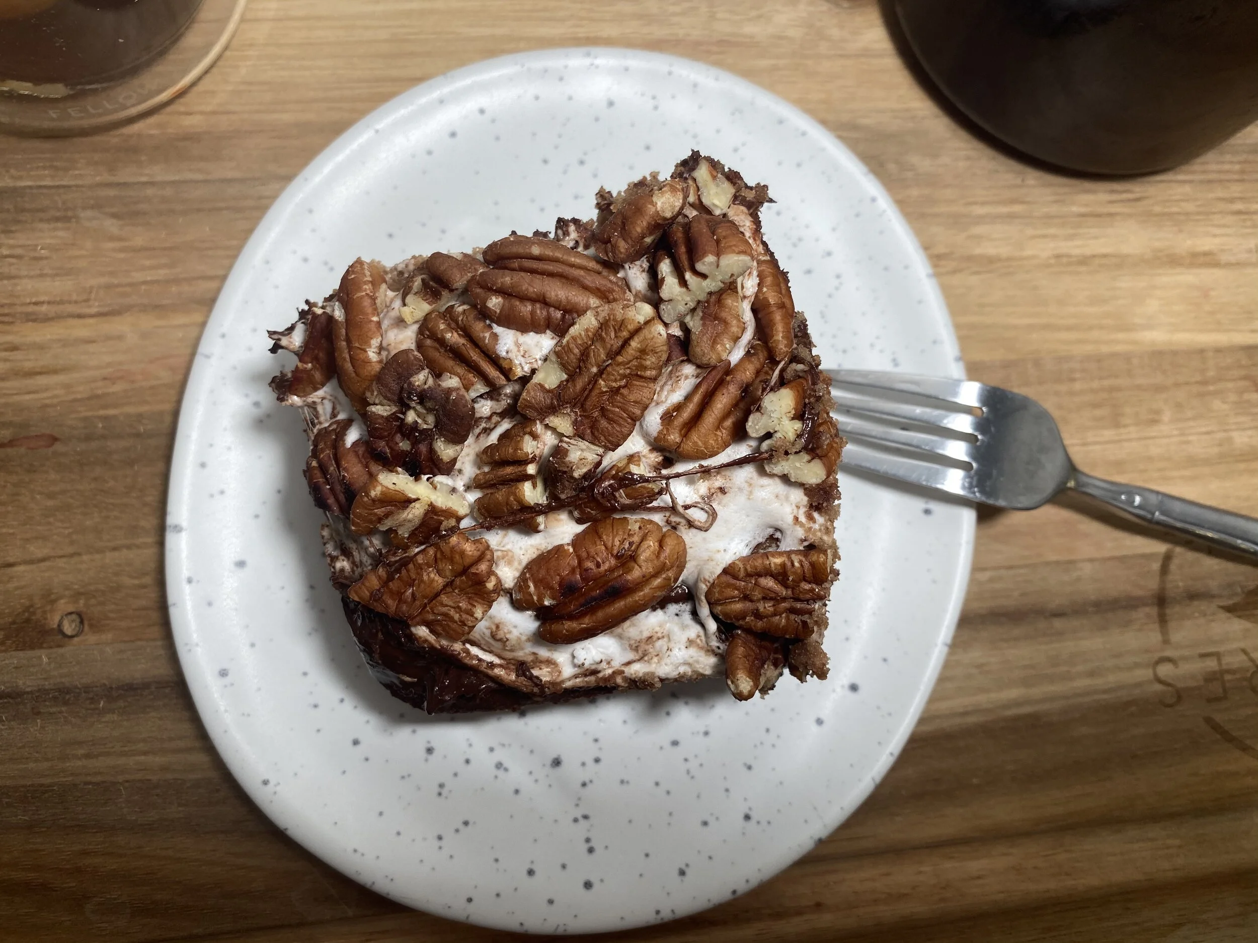 Espera unos minutos para que el calor del bizcocho derrita estos ingredientes. Luego, espárcelos por todo el tope del bizcocho con una espátula. Por último, añádele las pecanas por arriba.